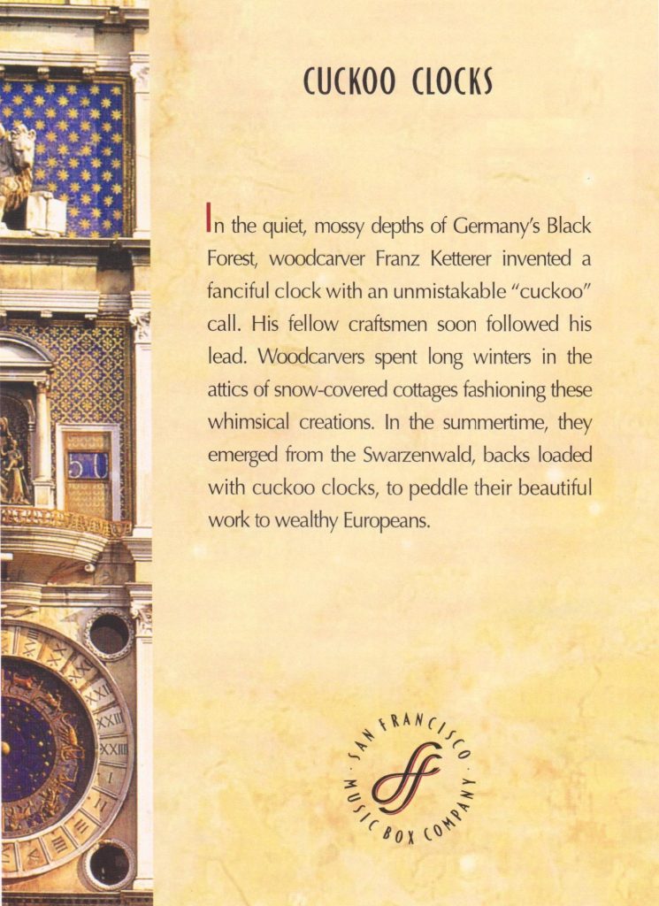To introduce a new line of musical clocks by The San Francisco Music Box Company for their retail shops, display copy was needed. I wrote a brief history beginning with the inventor of the cuckoo clock, designed to take the customer back to that simpler time in the Black Forest.