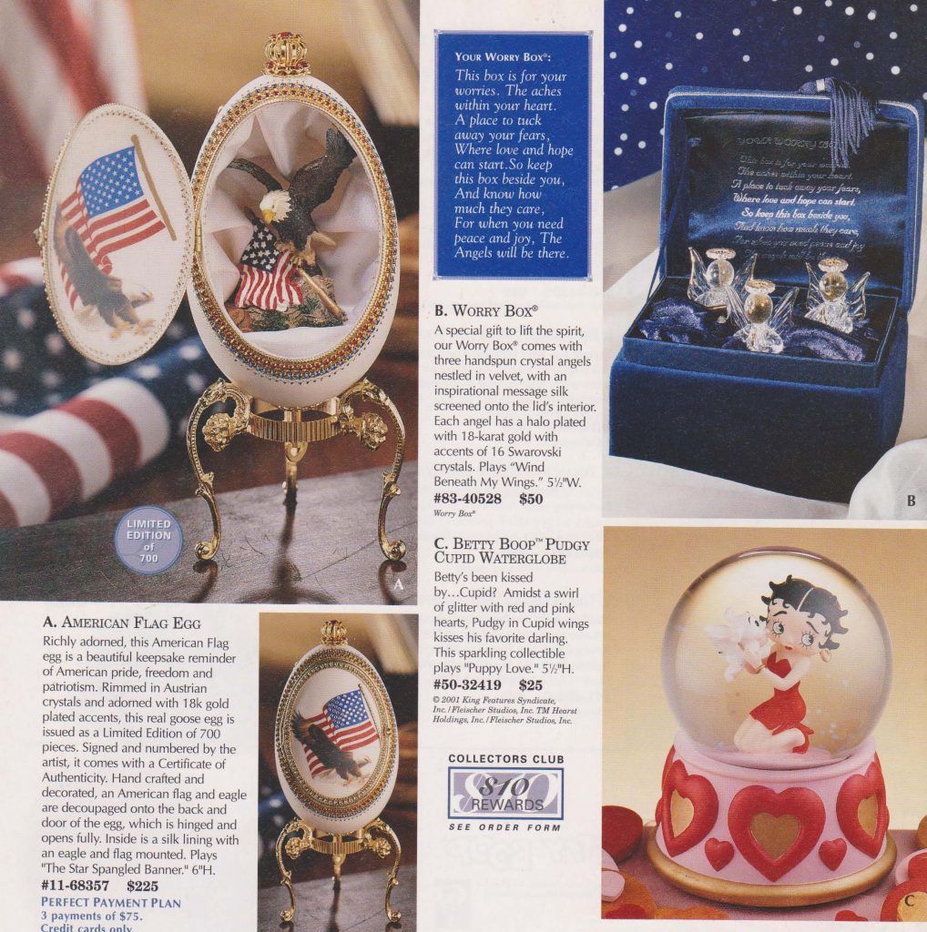 Catalog page featuring musical gifts of American icons, including the Stars and Stripes and Betty Boop.