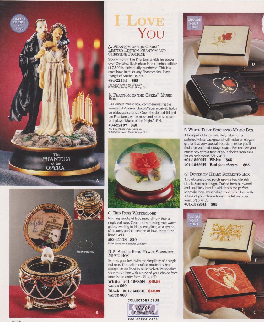 Pages from SFMB catalog featuring assorted music boxes designed to highlight Phantom of the Opera gifts.